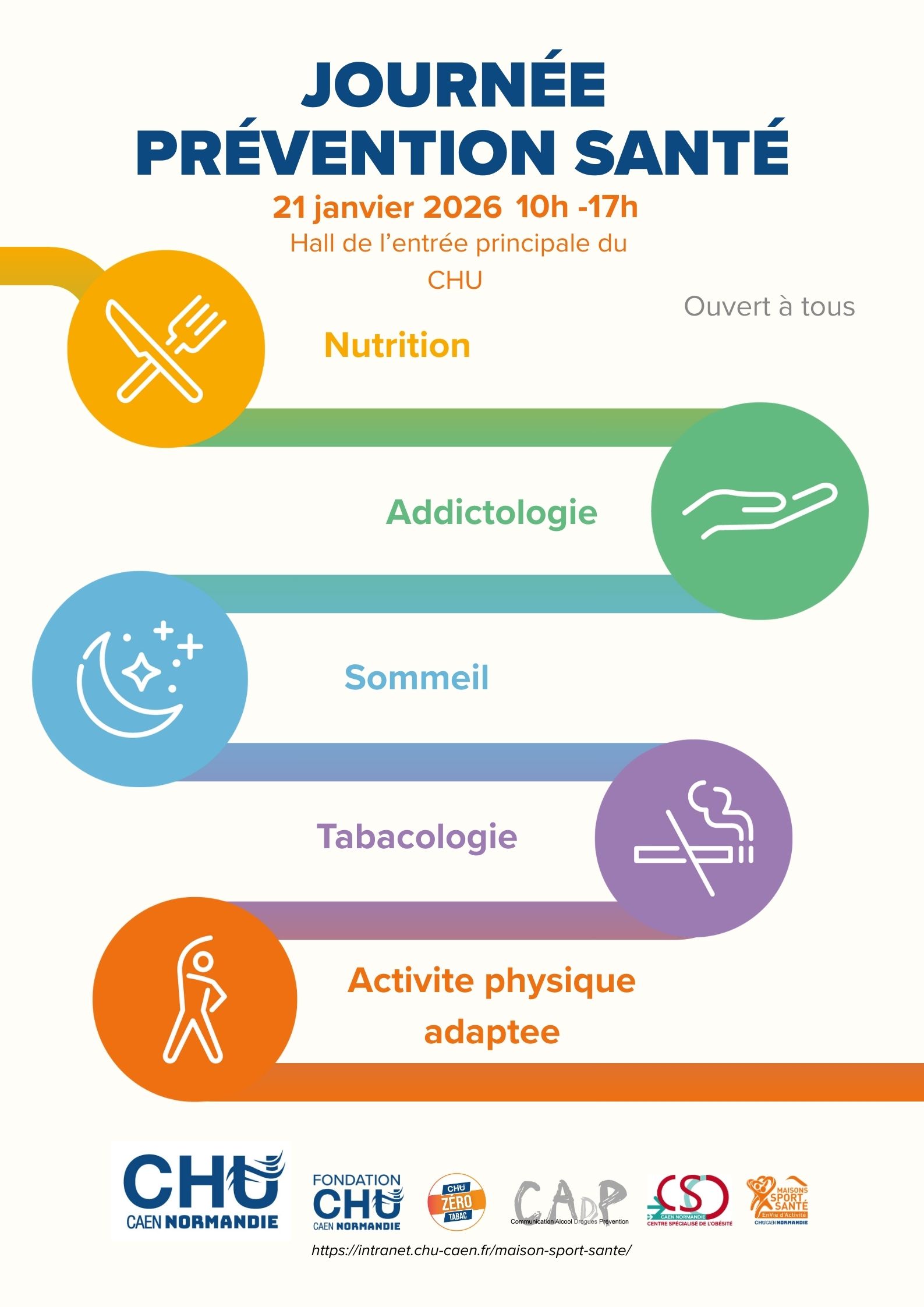 Le CHU Caen Normandie organise, en lien avec le Groupe Prévention Santé, sa première Journée Prévention Santé, le mercredi 21 janvier 2026, de 10h à 17h, dans le hall de l’entrée principale du CHU.