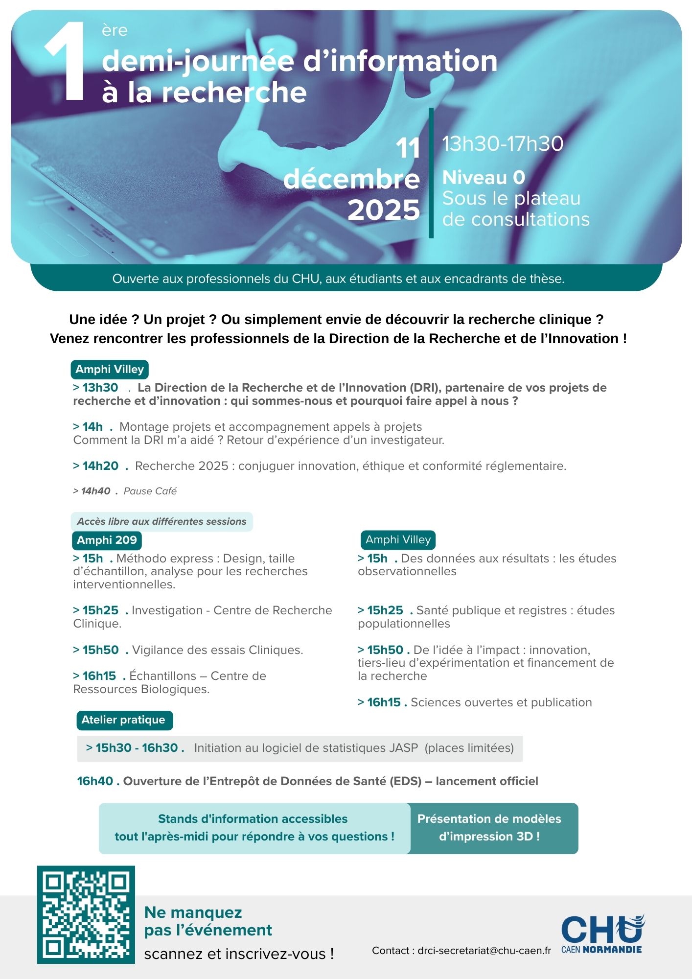 هذا الحدث الذي يستمر نصف يوم، والمفتوح لمحترفي جامعة CHU والطلاب ومشرفي الأطروحات، إلى تعزيز التواصل والتبادلات حول البحث والابتكار داخل جامعة CHU.