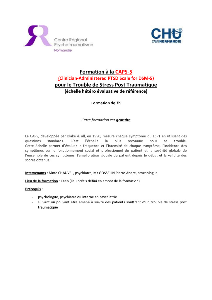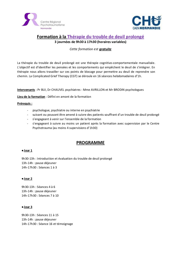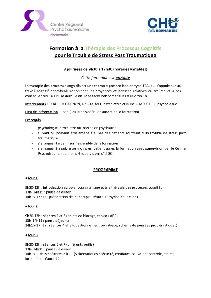 Pour toute annulation moins de 2 mois avant la formation merci de nous avertir par mail : psychotrauma@chu-caen.fr