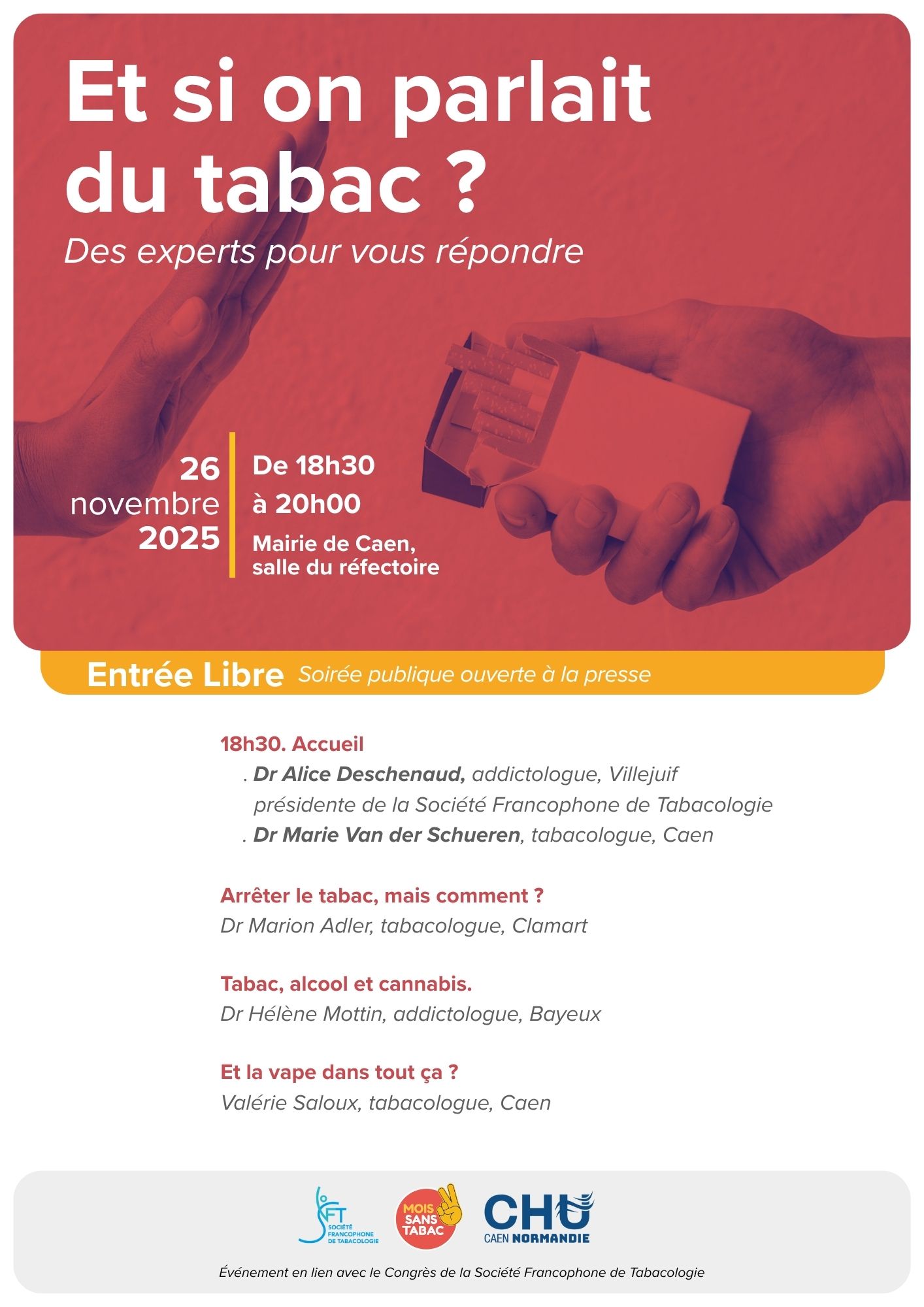 To mark the 10th anniversary of the No Tobacco Month , the Caen Normandy University Hospital and the Francophone Society of Tobacco Studies invite you to a public conference on Wednesday, November 26, 2025 , at Caen City Hall , from 6:30 p.m. to 8 p.m.